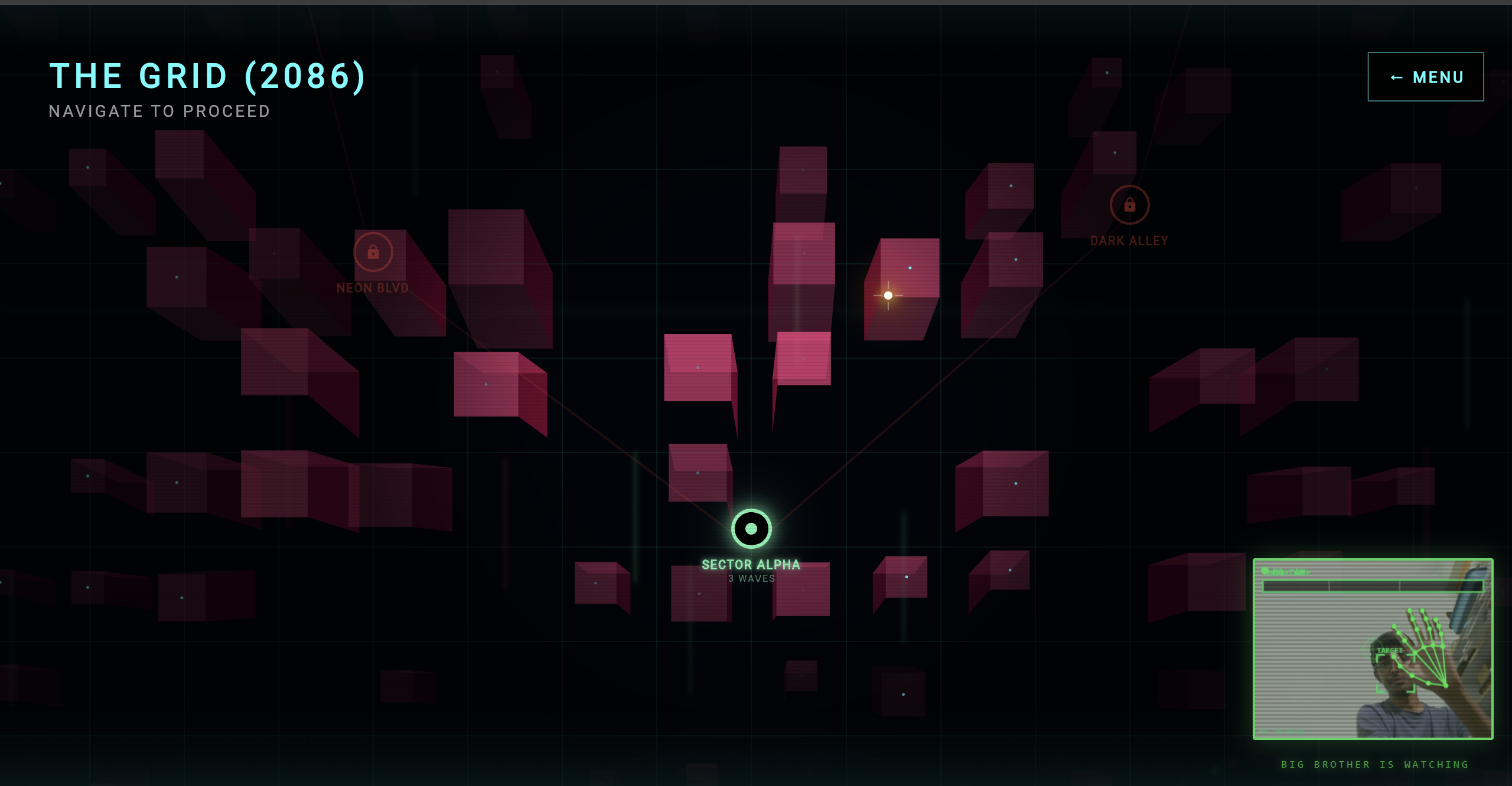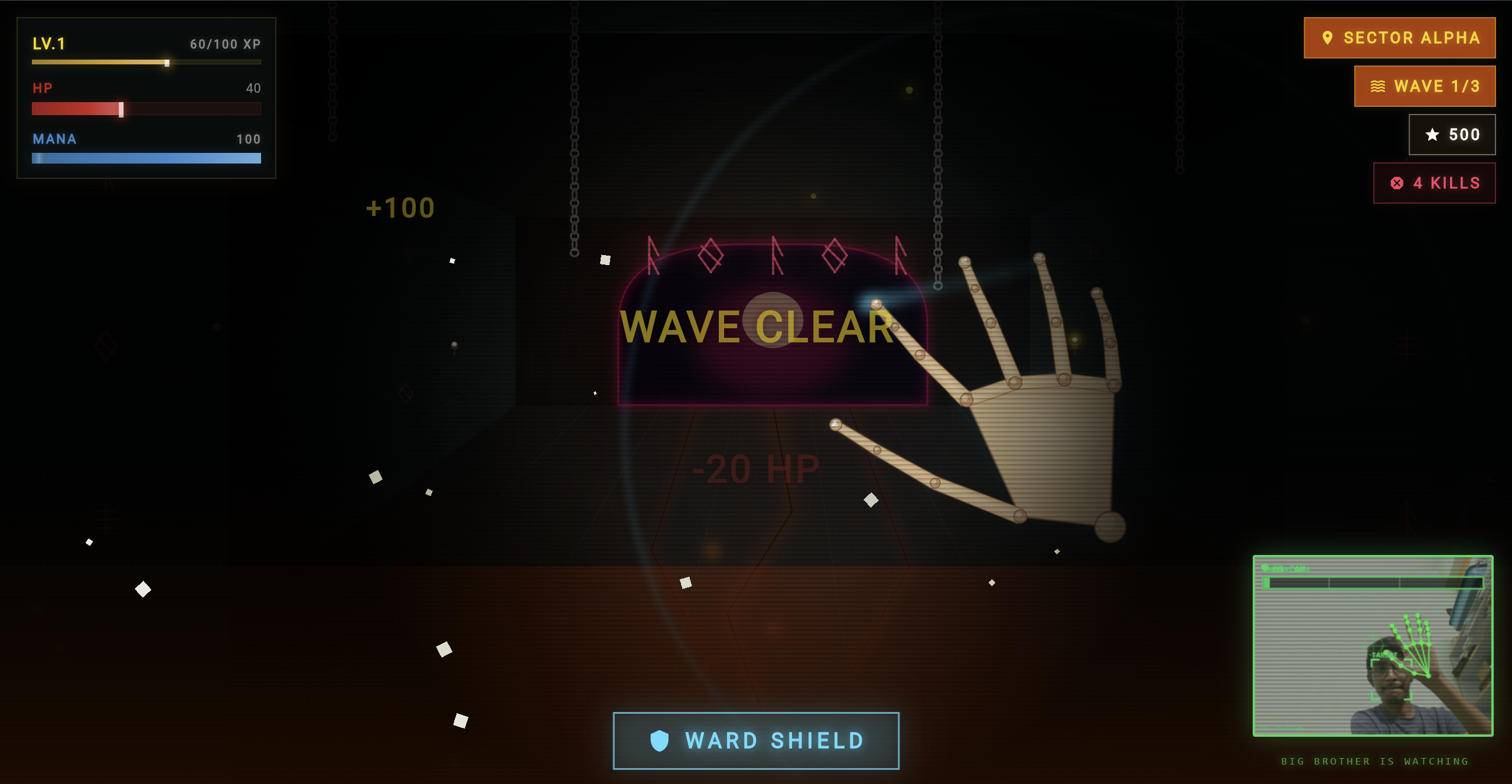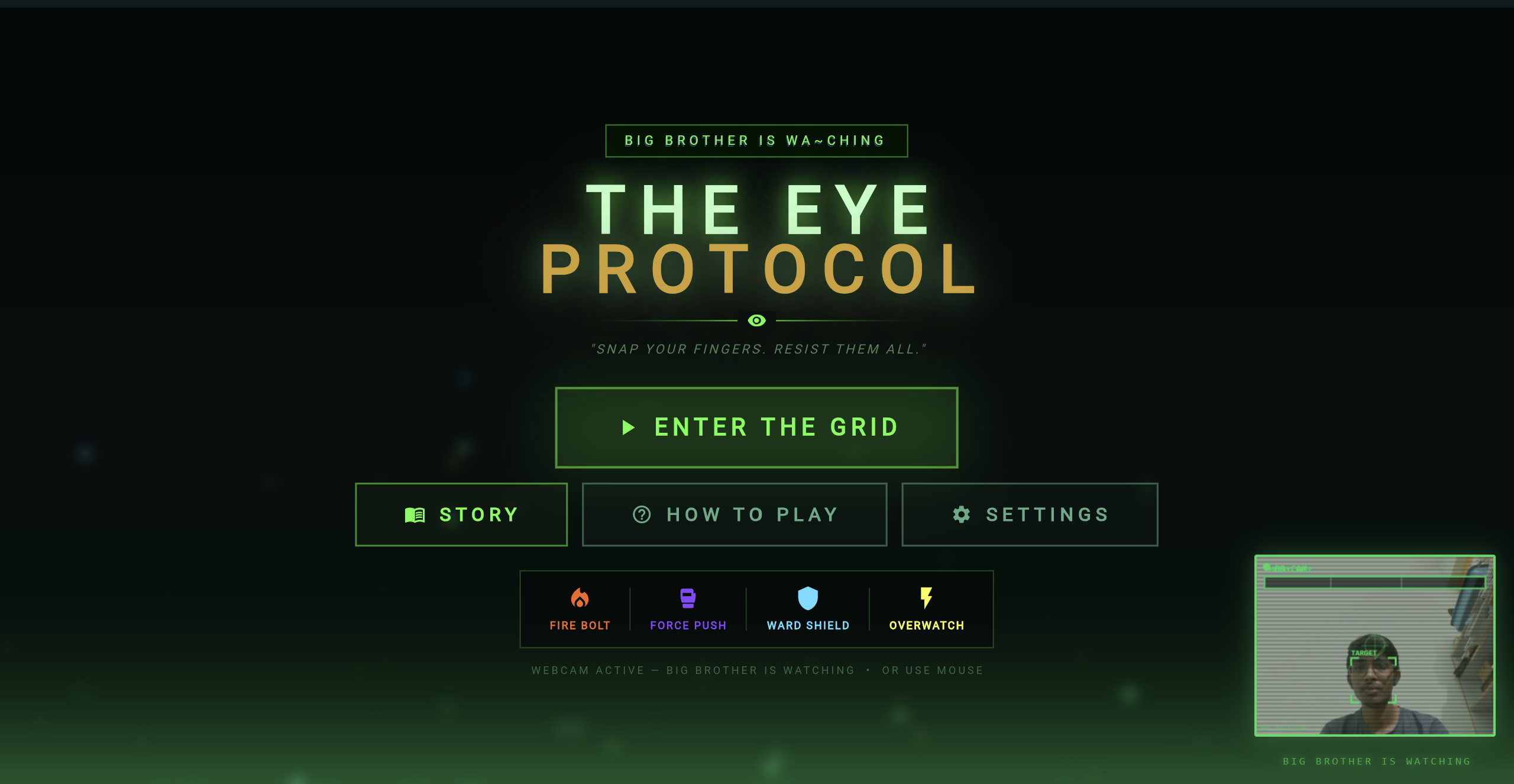 THE EYE PROTOCOL is a first-person gesture-combat game where your webcam becomes the controller. Cast spells with real hand signs, block incoming attacks, aim with your body, and survive inside a surveillance state that is actively watching you back.